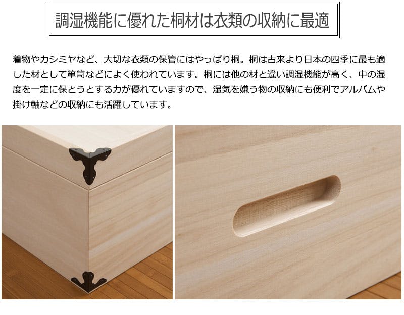着物や浴衣の収納に定番の桐衣装箱。洋室などのフローリングにも合うデザインで和室だけでなく幅広いシーンにはまります。桐材は内部を一定の湿度に保とうとする働きがあるので大事な着物や洋服などを湿気から守る桐箱にしまうのがベスト。クローゼット上などコンパクトな1段タイプからラインナップし、着物や浴衣、洋服など長期保管に最適です。別売りの衣装盆で買い足し積み重ねができるので増える着物と洋服をしっかり収納。
