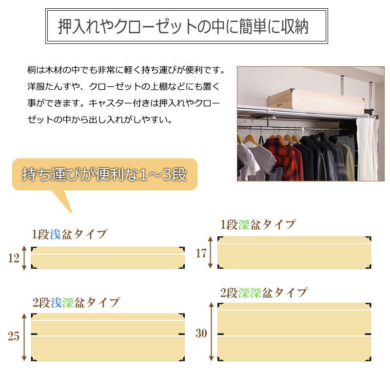 着物や浴衣の収納に定番の桐衣装箱。洋室などのフローリングにも合うデザインで和室だけでなく幅広いシーンにはまります。桐材は内部を一定の湿度に保とうとする働きがあるので大事な着物や洋服などを湿気から守る桐箱にしまうのがベスト。クローゼット上などコンパクトな1段タイプからラインナップし、着物や浴衣、洋服など長期保管に最適です。別売りの衣装盆で買い足し積み重ねができるので増える着物と洋服をしっかり収納。