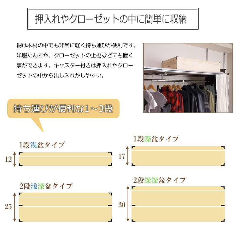 着物や浴衣の収納に定番の桐衣装箱。洋室などのフローリングにも合うデザインで和室だけでなく幅広いシーンにはまります。桐材は内部を一定の湿度に保とうとする働きがあるので大事な着物や洋服などを湿気から守る桐箱にしまうのがベスト。クローゼット上などコンパクトな1段タイプからラインナップし、着物や浴衣、洋服など長期保管に最適です。別売りの衣装盆で買い足し積み重ねができるので増える着物と洋服をしっかり収納。
