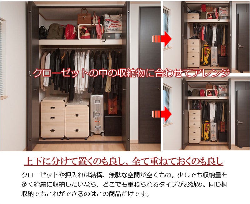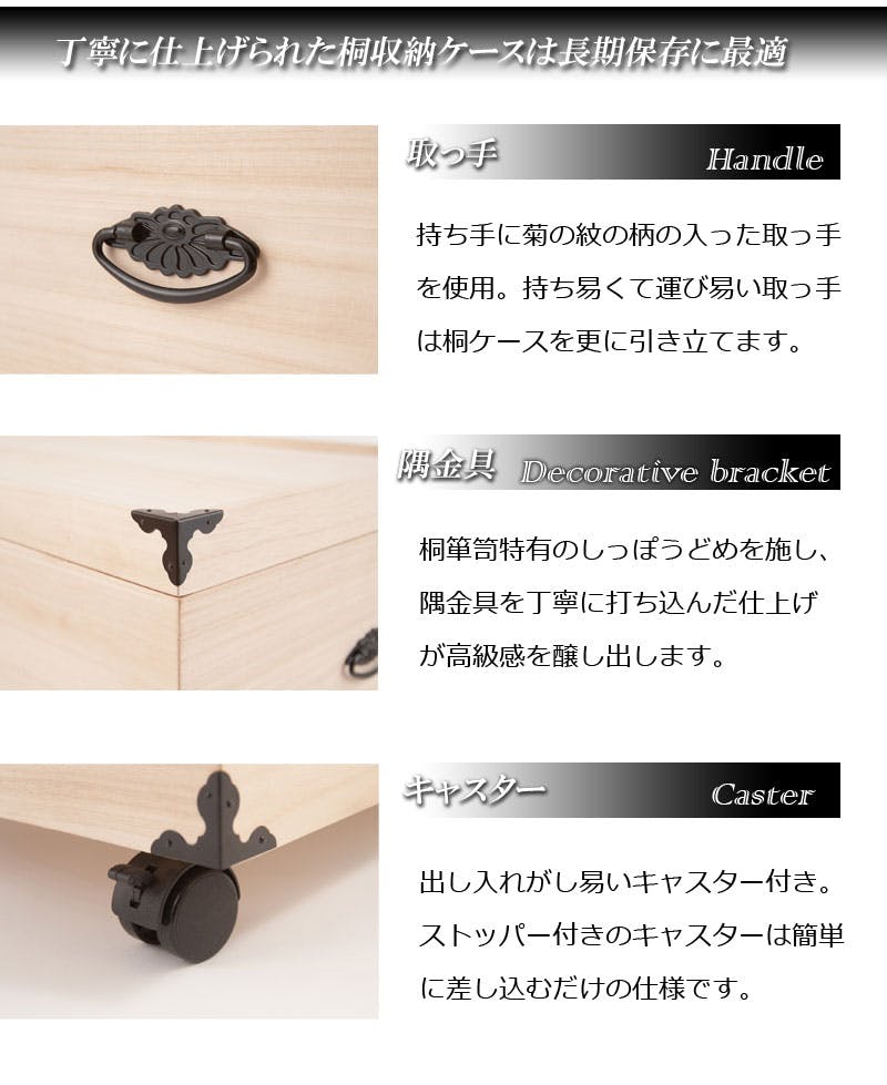 桐材は内部を一定の湿度に保とうとする働きがあるので、ひな人形や大事な着物などを湿気から守る桐箱にしまうのがベスト。もちろん押し入れやクローゼットに入るサイズで仕上げ、長期保管に最適です。冬物のかさばる大きな布団や毛布、衣類など保管したいものは全てここに。キャスター付きなので移動や出し入れが楽々。桃の節句のお雛さんや端午の節句の兜を収納するのにとても便利で重宝すること間違いなしです。