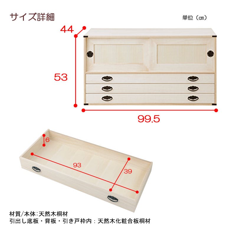 ■商品サイズ/本体;(約)幅99.5×奥行44×高さ53cm(奥行は取っ手を含んでおりません。取っ手を含むと2~3cmほど長くなります) ■引出し内寸/(約)幅93×奥行38×高さ6cm 盆内寸:(約)幅44×奥行34×高さ6(有効12)cm■日本製■完成品