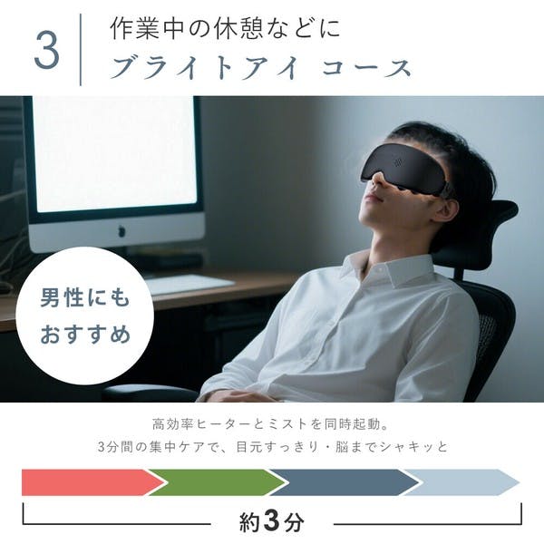 温熱機能はお好みに合わせて2段階調節可能。マッサージヘッドから伝わるぬくもりは、指先がそっと触れているかのような自然な心地よさ。目の疲れや緊張を和らげ、就寝前のリラックスタイムにもぴったり。温感が最後までしっかり続くよう設計されており、深い癒しを提供します。