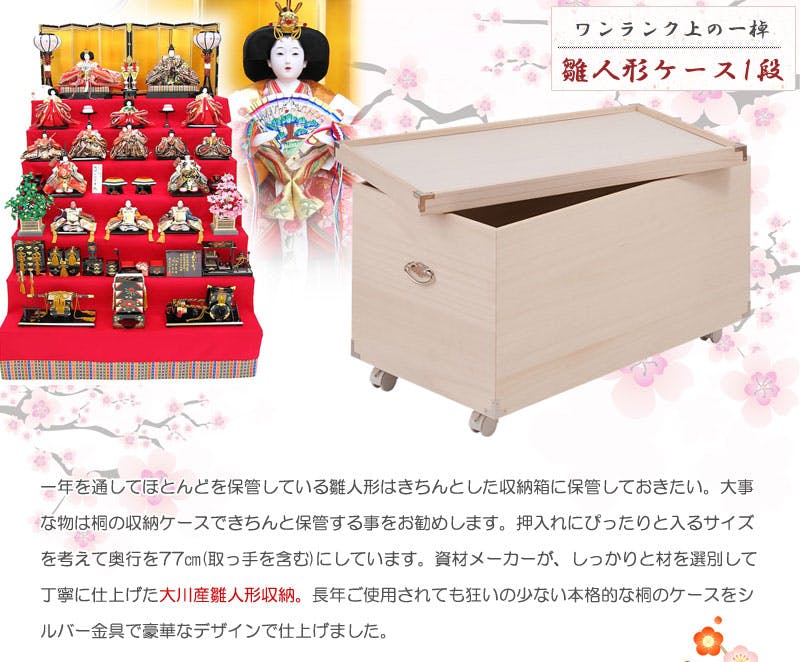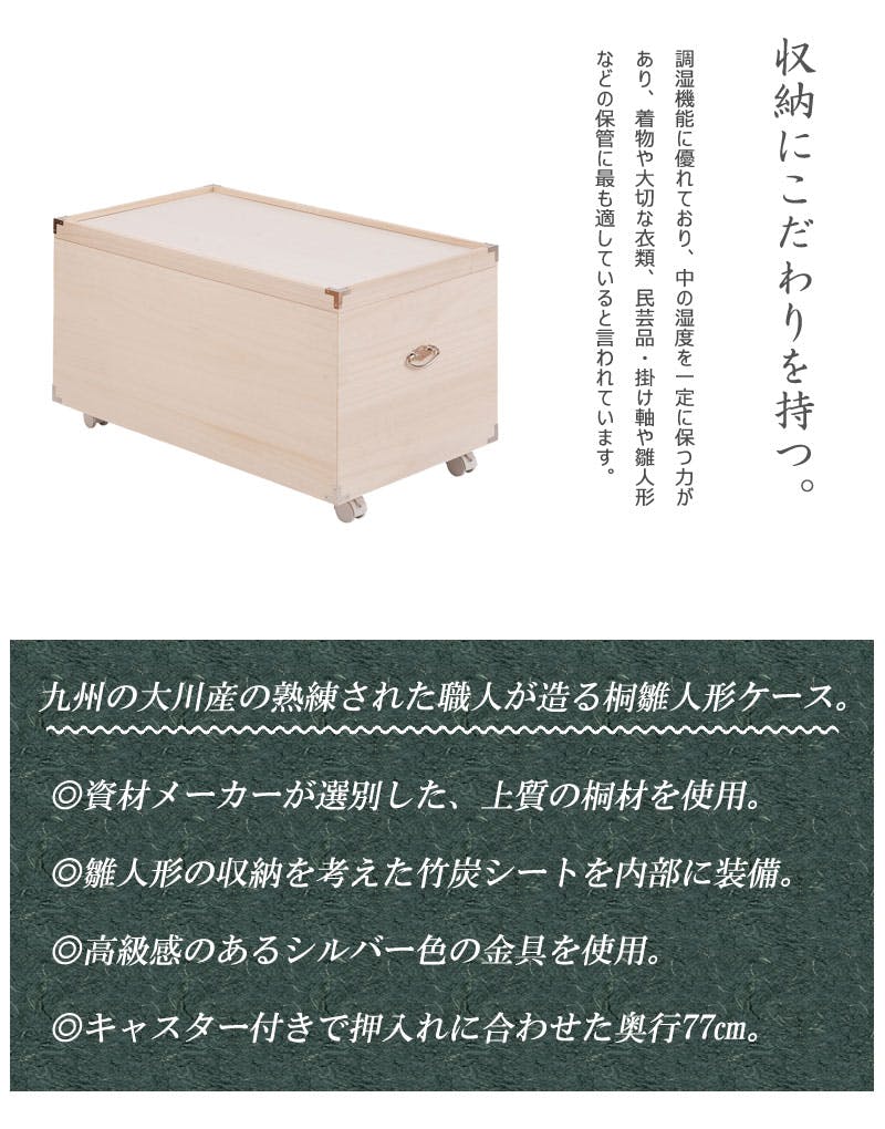 総桐雛人形収納ケース1段 高さ44cmタイプ 押入れクローゼットにも収納可能な奥行77cm 五月人形 ひな人形 着物収納 桐の衣装ケース 桐衣装箱 収納ボックス 和ダンス 桐たんす 完成品 日本製 大川 木製 引き出し 桐箪笥 キャスター付き 桐ケース 着物用 着物 収納ケース 桐