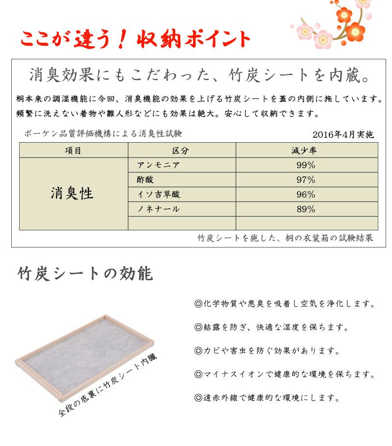 本体:天然木(桐材)、天板・底板:天然木桐化粧板、蓋裏面・底面:竹炭シート内蔵不織布