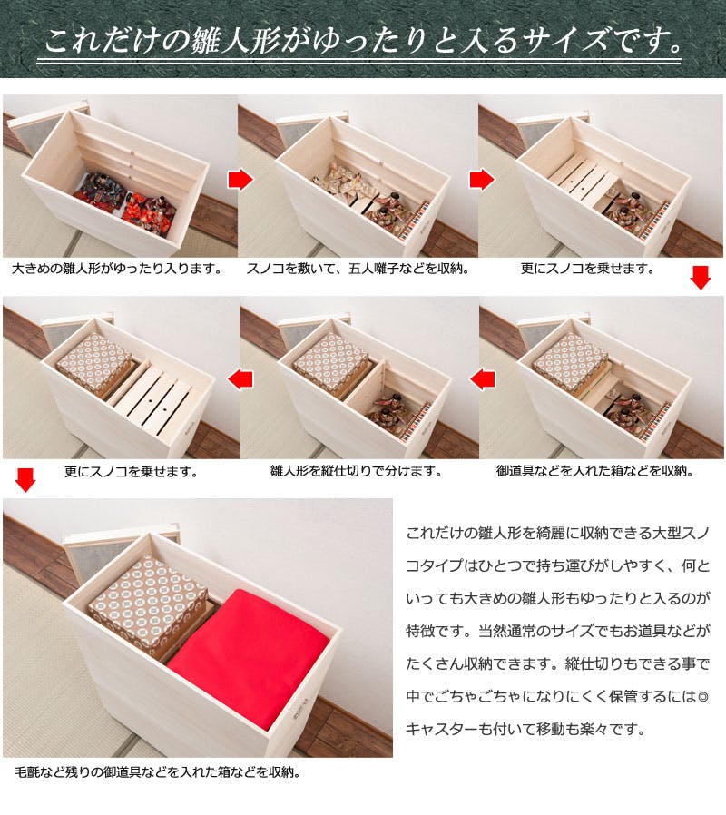九番親王サイズ、京七番親王サイズが、綺麗に収まる大容量の収納力!たっぷり入る深さ72.5cmの大容量で布団や衣類などの保管にも。シルバー色の取っ手、隅にシルバー色の飾り金具を手打ちした豪華仕様に加え、キャスター付で移動も楽々、近くに持ってきて雛人形を飾りつけできます。量が入るから色んな物が収納でき、取外し可能なスノコでバッグ類を上下に分けたり、衣類・布団等かさばる物の収納にGood。