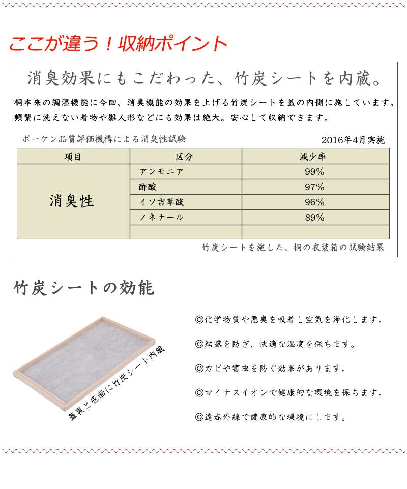 本体:天然木(桐材)、天板・底板:天然木桐化粧板、蓋裏面・底面:竹炭シート内蔵不織布