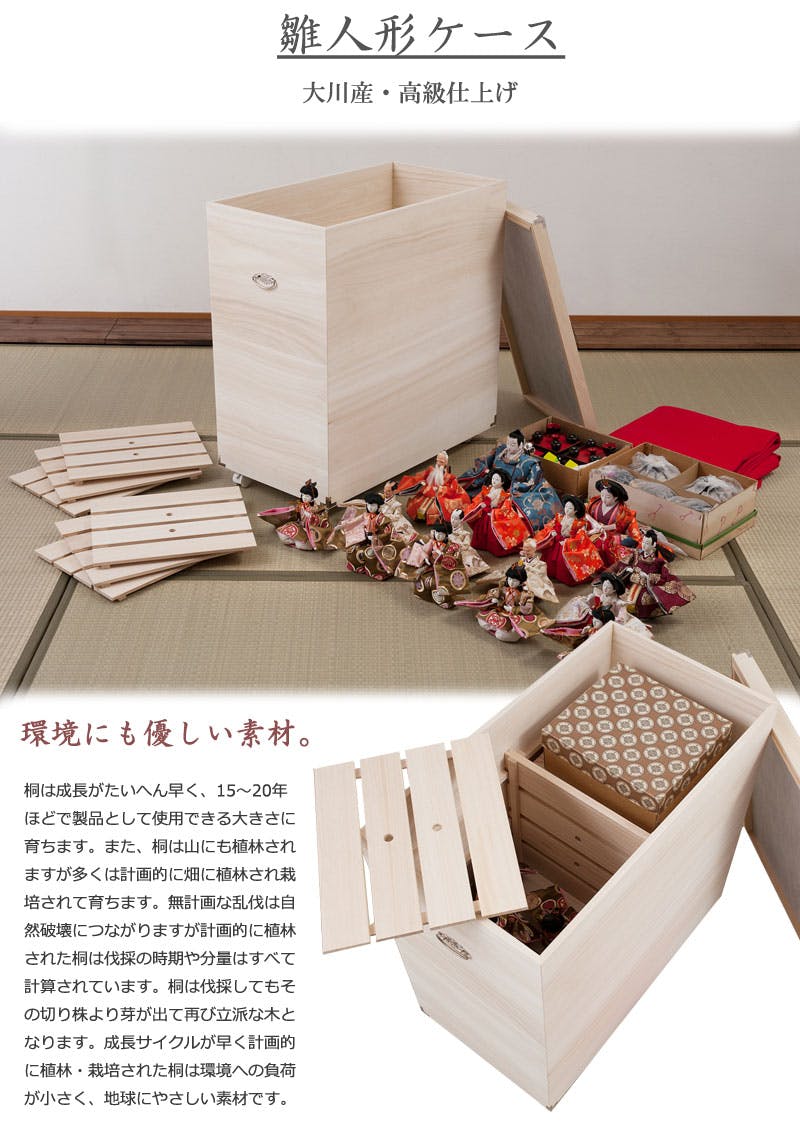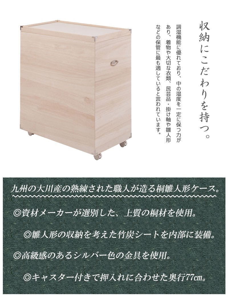 桐材は内部を一定の湿度に保とうとする働きがあるので、ひな人形や大事な着物などを湿気から守る桐箱にしまうのがベスト。竹炭シートを施しているので、消臭効果もプラス!年間でほとんどを収納している雛人形はきちんと保管したい、大事な物は桐の収納ケースできちんと収納したいを可能にした深型桐収納ケースが新登場!