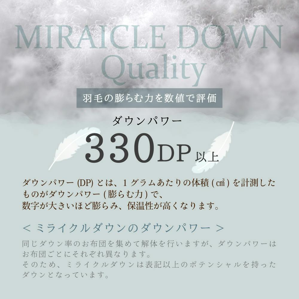 側生地:ポリエステル85%綿15%【立体キルト加工】8箇所ループ付 中わた:ダウン80%フェザー20% 1.1kg リサイクル羽毛(ミライクルダウン)を使用 生産国:日本(丸八真綿)付属品:専用不織布ケース付