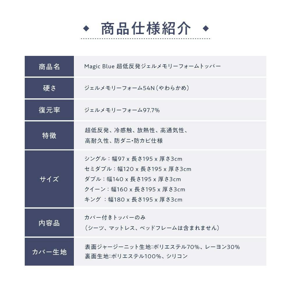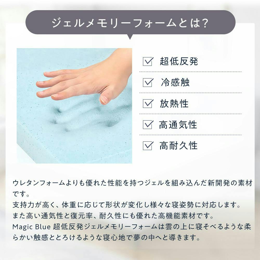 超低反発、冷感触、放熱性、高通気性、高耐久性、防ダニ・防カビ仕様