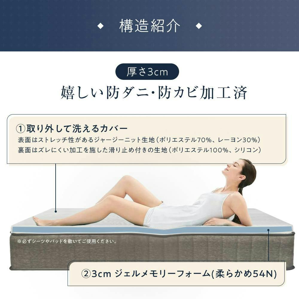 • 超低反発ジェルメモリーフォームトッパー 柔らかいトッパー カバー洗える 冷感ジェルマットレス 厚さ3センチ 柔らかめ 薄いマットレスパッド ダブルサイズ 通気性 硬すぎるベッドマットレスの上に敷くだけで寝心地改善