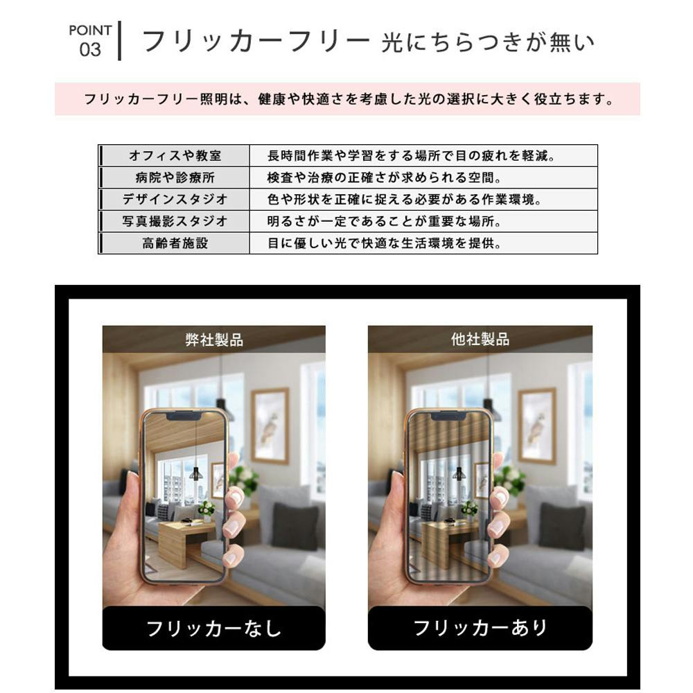 ■フリッカーフリー設計なので長時間使用しても目が疲れにくく、頭痛や肩こりの軽減、ちらつきがない安定した光環境で集中力の向上、写真や動画撮影への影響軽減「ローリングシャッター現象」や縞模様の映り込みを防ぐ効果があります。※完全にフリッカーの影響を抑えたい場合は、全体の照明を統一してください。