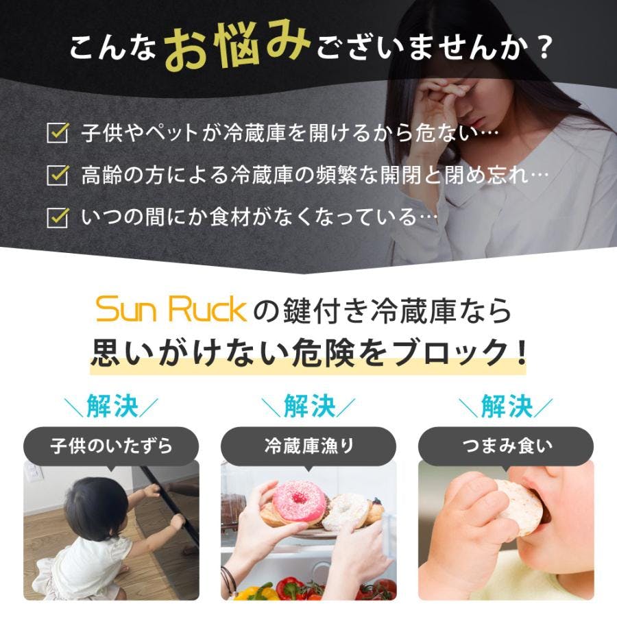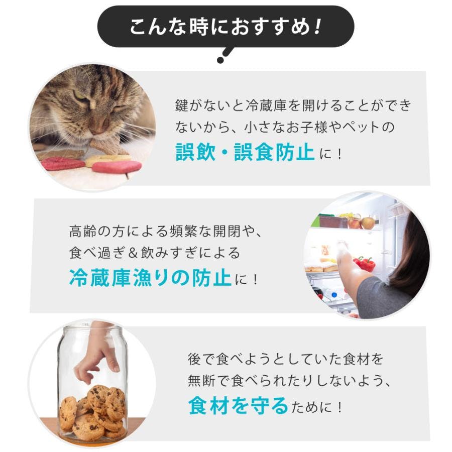 鍵付きだから安心/扉をロックし、イタズラやケガなどを防ぐ鍵付き冷蔵庫。お子様やペットを予期せぬ危険から守ります!・誤飲、誤食防止に!・冷蔵庫漁りの防止に!・食材を守るために!