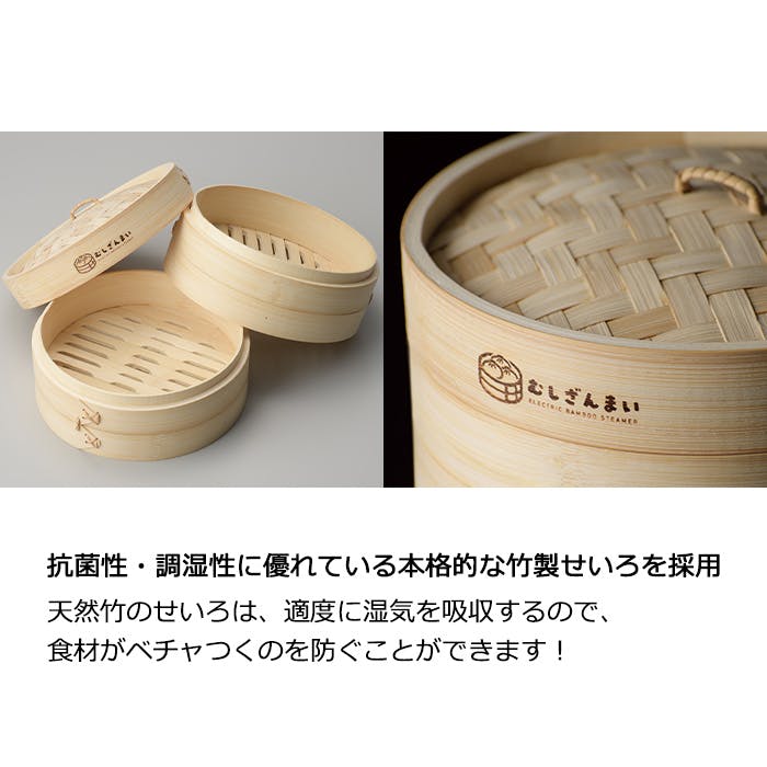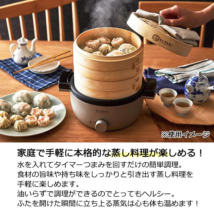 家庭で手軽に本格的な蒸し料理が楽しめる 電気せいろ蒸し器です。水を入れてタイマーつまみを回すだけであとはほったらかしでOK!食材の旨味や持ち味をしっかりと引き出すことができ、ふっくらジューシーに仕上がります。蒸し鍋も本体から取り外し可能なのでお手入れもラクラク。8品目のヘルシーレシピを収録したレシピブック付です。