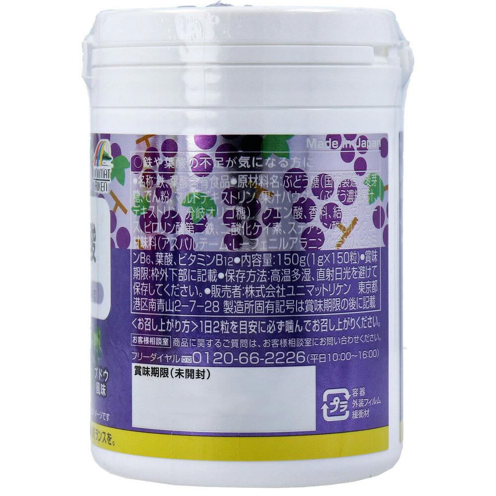 美味しく栄養補給!!水なしで噛んで美味しいチュアブルタイプのサプリメントです。2粒で鉄12mg、葉酸200μgが摂取出来ます。●ぶどう風味。●鉄や葉酸の不足が気になる方におすすめ。