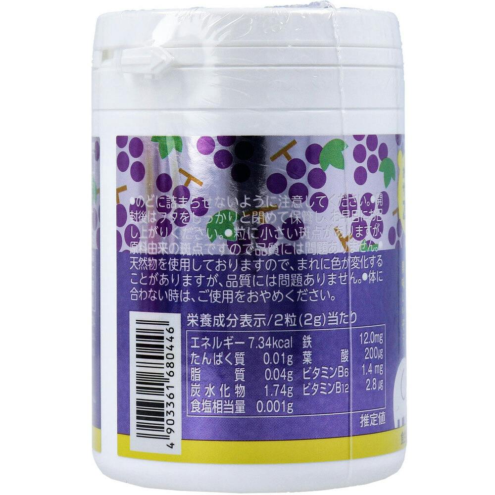 ぶどう糖(国内製造)、麦芽糖、でん粉、マルトデキストリン、ぶどう果汁パウダー(ぶどう濃縮果汁、デキストリン、分岐オリゴ糖)/クエン酸、香料、結晶セルロース、ピロリン酸第二鉄、二酸化ケイ素、ステアリン酸カルシウム、甘味料(アスパルテーム・L-フェニルアラニン化合物)、ビタミンB6、葉酸、ビタミンB12