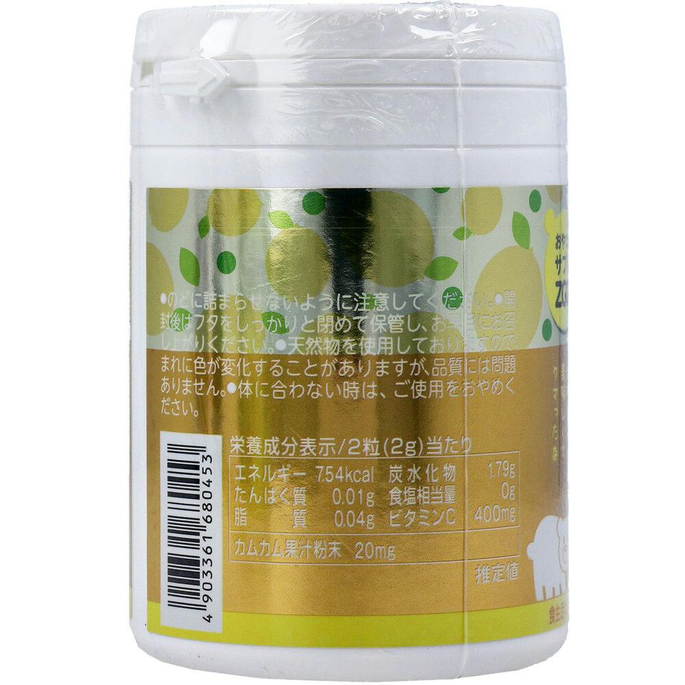 美味しく栄養補給!!水なしで噛んで美味しいチュアブルタイプのサプリメントです。2粒でビタミンC400mg、カムカム果汁粉末20mgが摂取出来ます。●レモン風味。●美容を気遣う方、忙しく頑張る方におすすめ。●ポリポリおやつの様に食べられます。