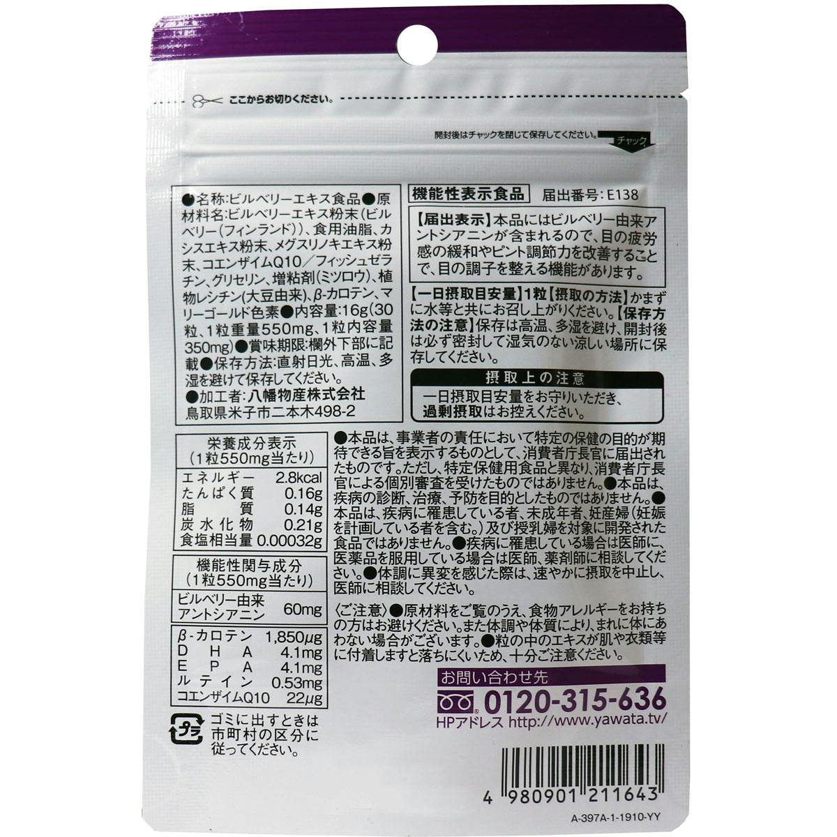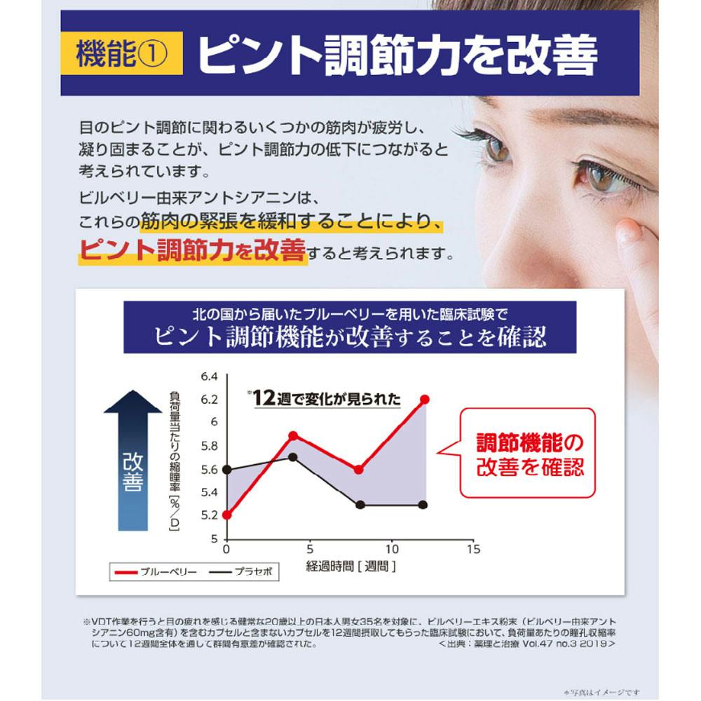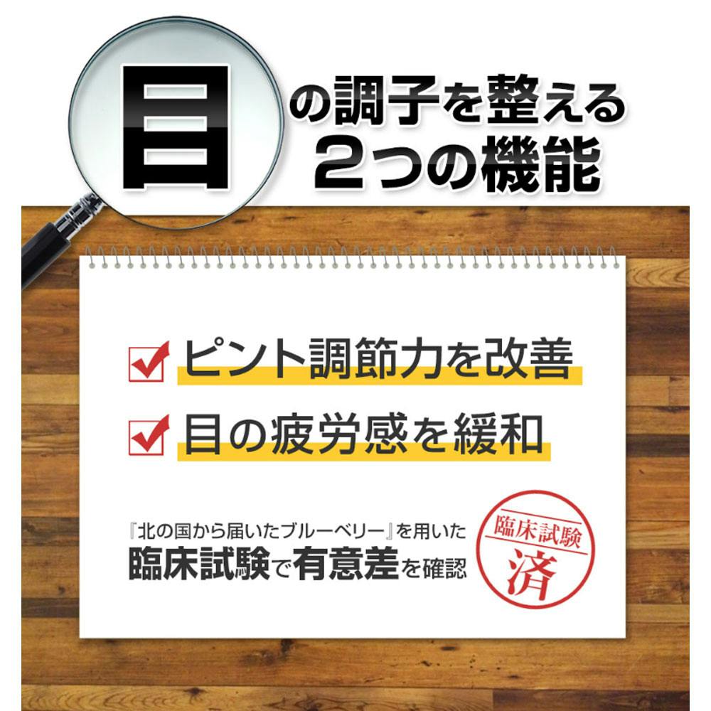 届出番号:E138機能性関与成分ビルベリー由来アントシアニン届出表示:本品にはビルベリー由来アントシアニンが含まれるので、目の疲労感の緩和やピント調節力を改善することで、目の調子を整える機能があります。