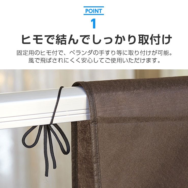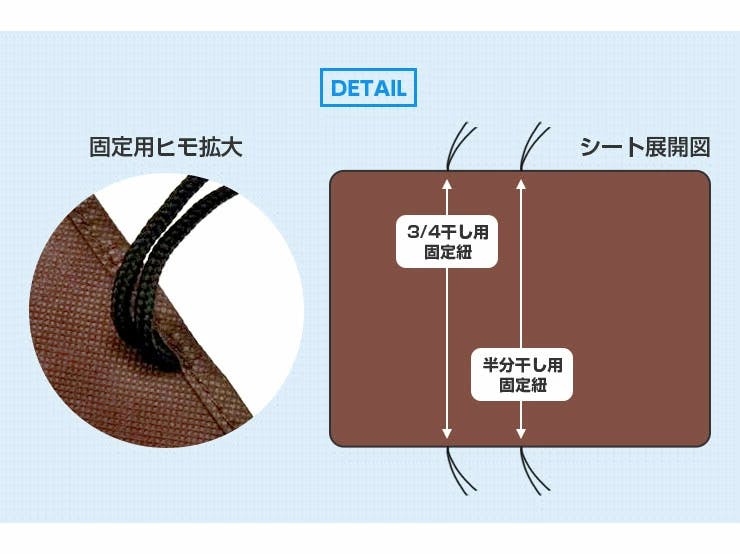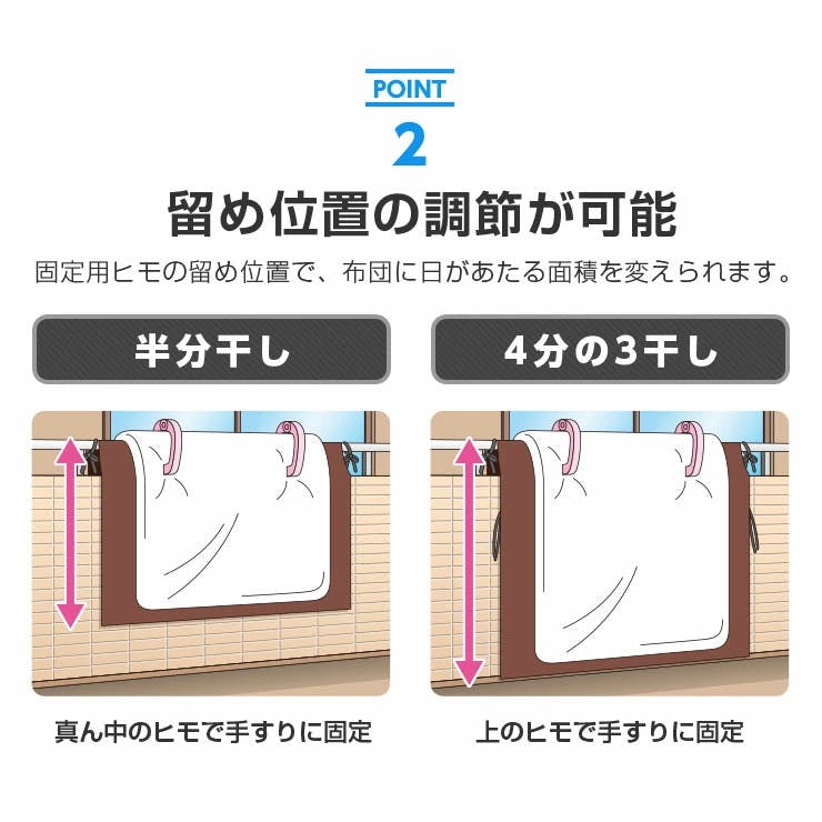 ベランダの桟にかけ両端の紐で結び固定。シートから布団がはみ出さないように注意。
