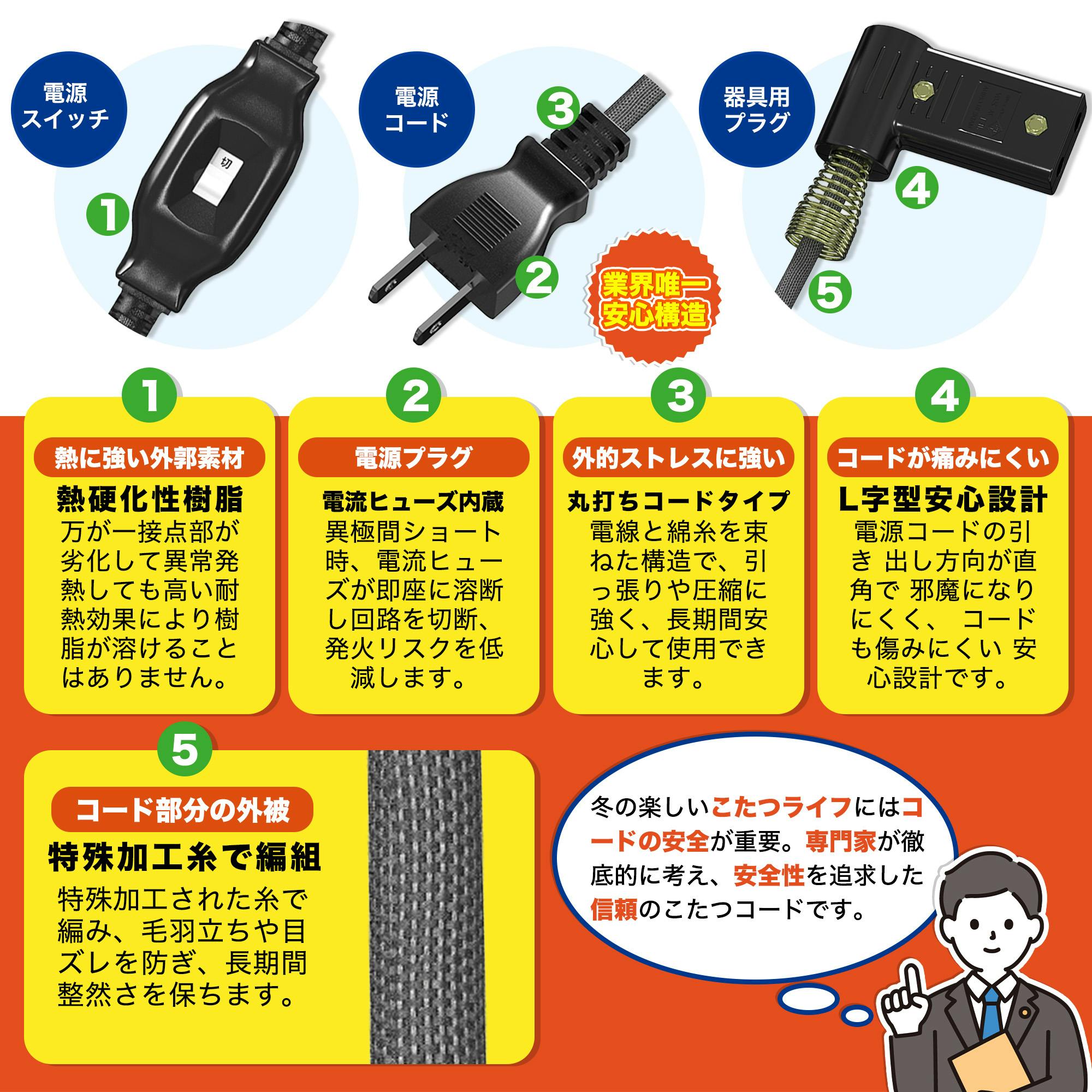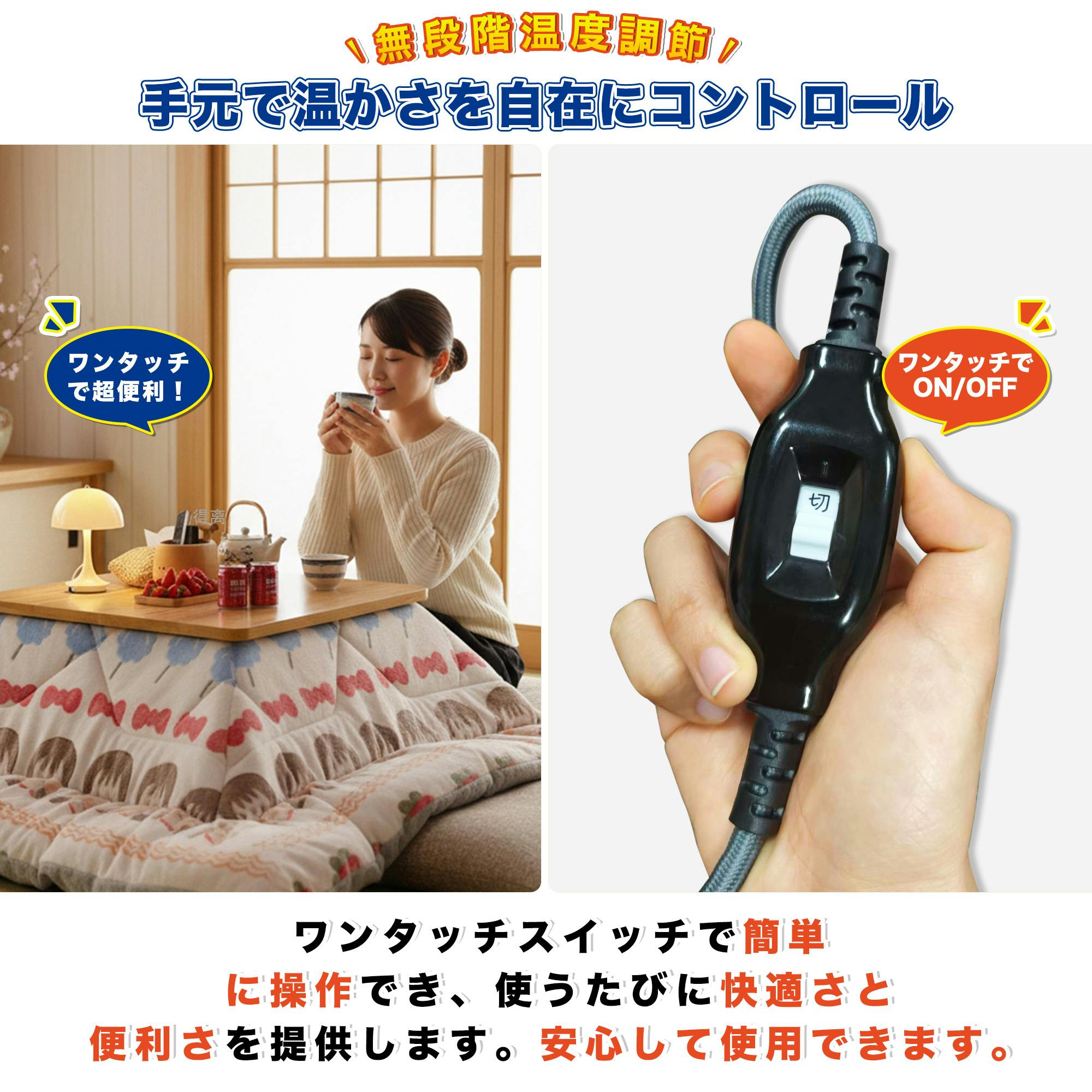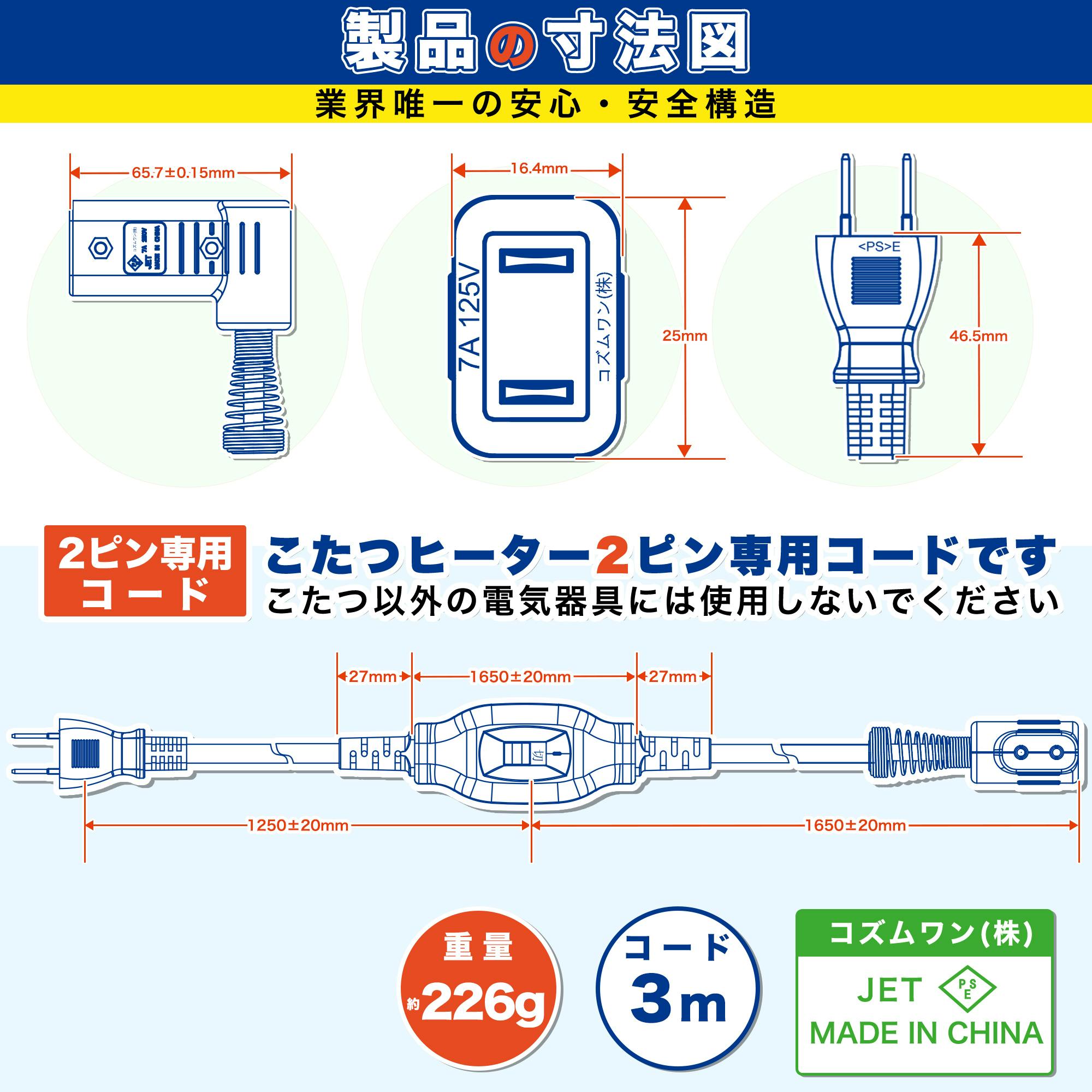 KOZUMUWAN こたつコード 3m 中間スイッチ付 コタツケーブル L型プラグ こたつ コンセント 換用 電源コード 折り曲げ 熱に強い ブッシング スプリング付き 125V 7A シンプル 吊り下げフック付