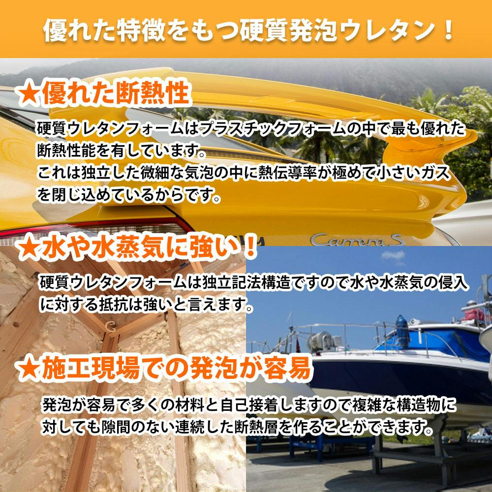★優れた断熱性:硬質ウレタンフォームはプラスチックフォームの中で最も優れた断熱性能を有しています。これは独立した微細な気泡の中に熱伝導率が極めて小さいガスを閉じ込めているからです。★水や水蒸気に強い!:硬質ウレタンフォームは独立記法構造ですので水や水蒸気の侵入に対する抵抗は強いと言えます。★施工現場での発泡が容易:発泡が容易で多くの材料と自己接着しますので複雑な構造物に対しても隙間のない連続した断熱層を作ることができます。