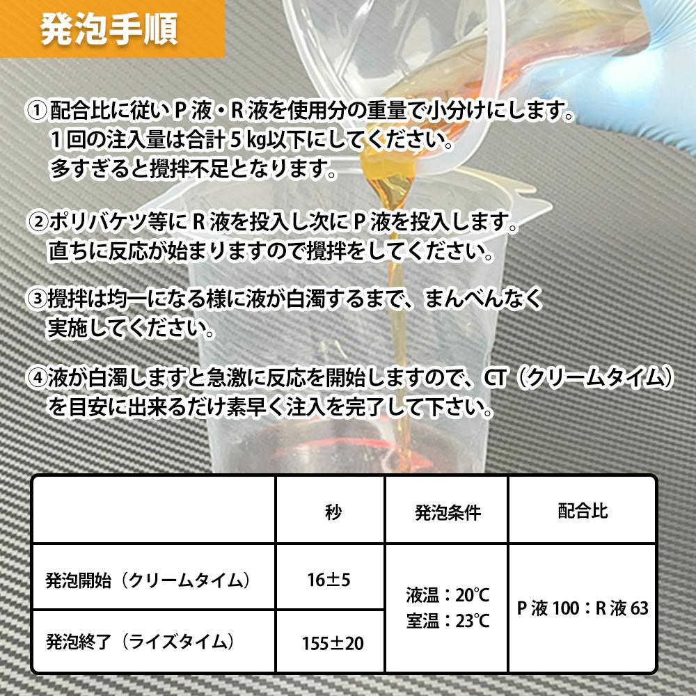 ★P液・R液の2液を混合攪拌すると発泡し硬化します。★ハンドミキシング用に反応性が遅いタイプです。★混合重量比は100:63です。★発泡剤はオゾン層を破壊しない次世代フロン(HFC-245fr/HFC-365mfc混合)を使用しています。★発泡倍率は自由発泡の場合で、型内で発泡する場合は発泡倍率が半分程度まで下がる場合もありますので、量には余裕をもってください。