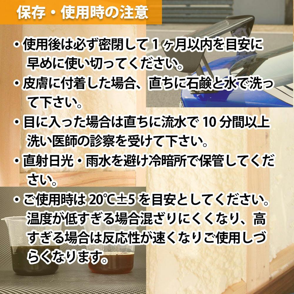 ・使用後は必ず密閉して1ヶ月以内を目安に早めに使い切ってください。・皮膚に付着した場合、直ちに石鹸と水で洗って下さい。・目に入った場合は直ちに流水で10分間以上洗い医師の診察を受けて下さい。・直射日光・雨水を避け冷暗所で保管してください。・ご使用時は20℃±5を目安としてください。温度が低すぎる場合混ざりにくくなり、高すぎる場合は反応性が速くなりご使用しづらくなります。