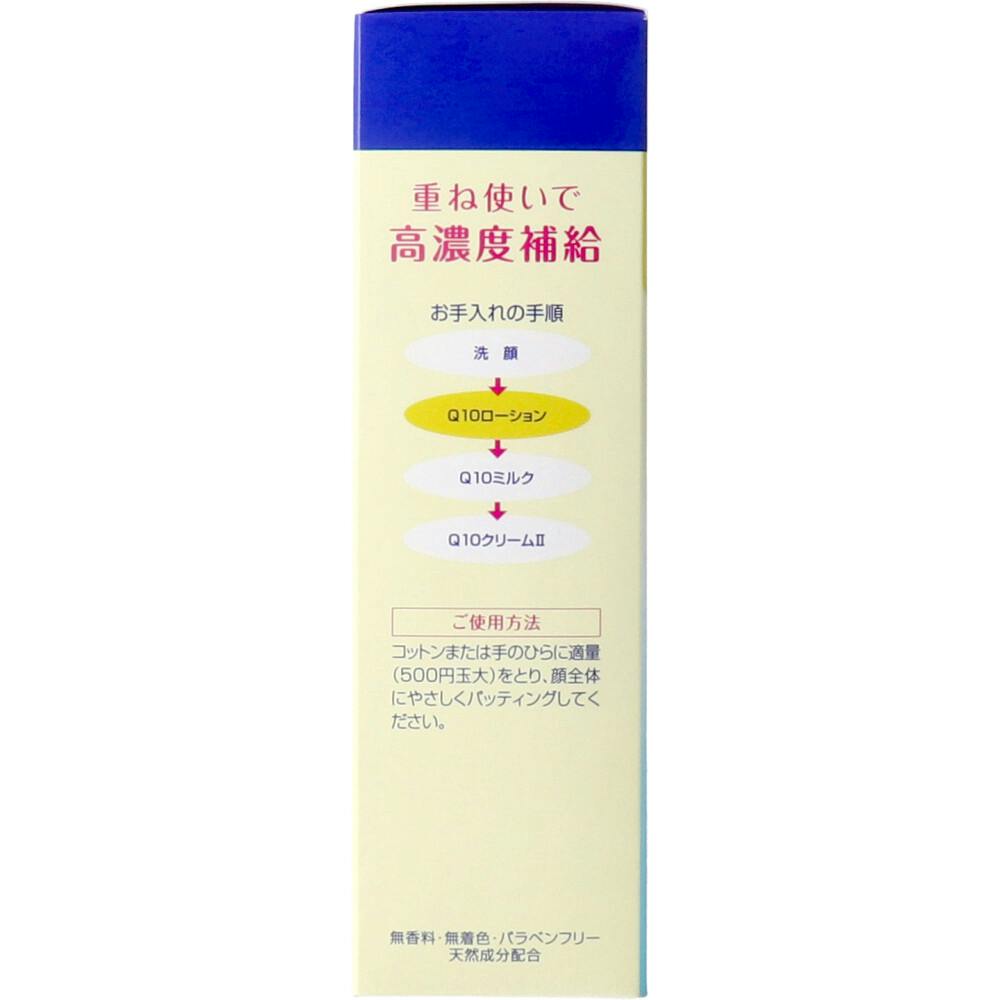 肌、しっとり いきいき美肌の重要成分 コエンザイムQ10配合。●加齢や紫外線の影響により、年々減少していく美肌の重要成分コエンザイムQ10を配合。●優れた浸透力で、角層のすみずみにすばやくいきわたり、しっとりとしたうるおいで満たします。●浸透力と保水力を追求した、おだやかな使い心地の化粧水です。●無香料・無着色・パラベンフリー・天然成分配合。