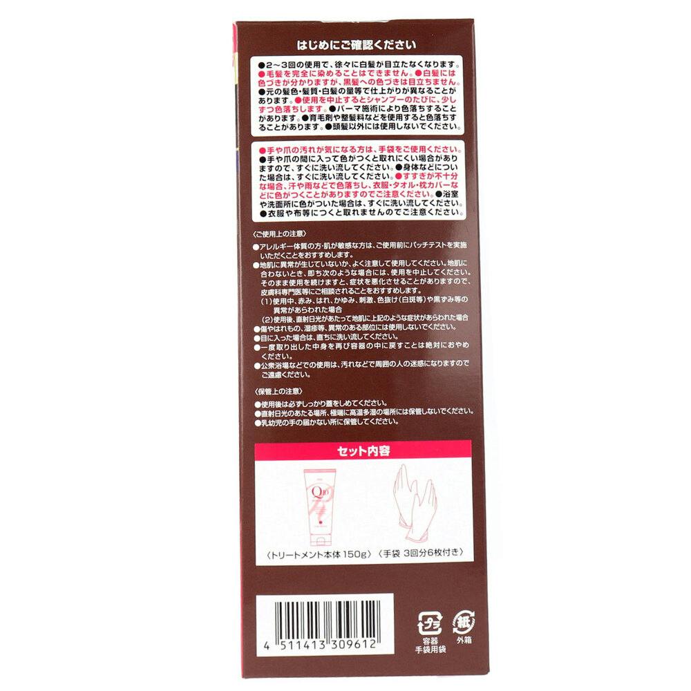1回5分、美しくつややかな理想の髪色に染める!自宅で簡単・手軽に、白髪をしっかり色濃く、理想の髪色に染めることができるカラートリートメントです。放置時間は1回5分!髪になじむ色設計で、使うたび白髪が深く色づき、美しく自然な思い通りの髪色へ。●さらに、キューティクルまでケアする「カラーフィックス・キューティクルコート」が、色落ちを防ぎ、染めたての色つやを持続させるとともに、うねりをケアする機能により、白髪の目立たない、若々しく美しい髪へと導きます。●コエンザイムQ10など豊富な
