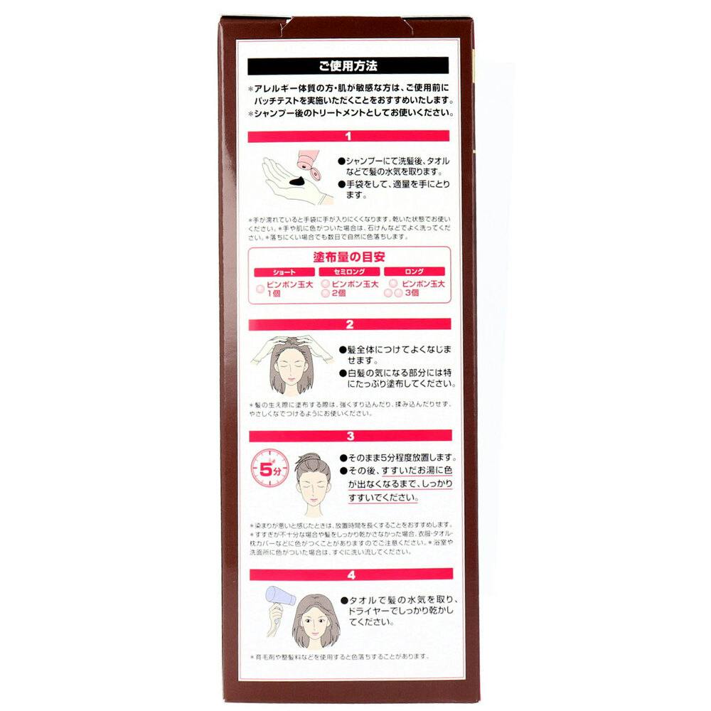※シャンプー後のトリートメントとしてお使いください。(1)塗布します・シャンプーにて洗髪後、タオルなどで髪の水気を取り、適量を髪全体につけてよくなじませます。※手や爪への色づきが気になる方は、手袋(別売)をご使用ください。★塗布量の目安ショート :ピンポン玉大1個セミロング:ピンポン玉大2個ロング  :ピンポン玉大3個★塗布方法白髪部分・カラーリングしたい部分を中心に直接塗布してください。(2)時間をおきますそのまま5分程度放置します。★きれいに染めるポイント放置時間にお手持