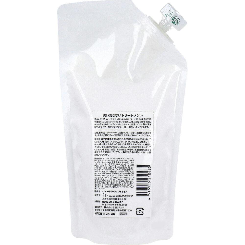 ドライヤー熱と紫外線から髪を守るトリートメント。寝ている間に毛先のパサつき・ダメージ集中ケア。はちみつ配合で、頭皮を健康に。●馬油・ツバキ油・ヒアルロン酸・植物抽出液・セラミド(保湿成分)の配合によりたっぷりのうるおいで満たし、傷んだ髪を集中補修。●キューティクルをコーティングし、しなやかで指通りのよい髪へ導きます。●ドライヤー熱から髪を守り、一本一本をしっかりケアします。●そのまま使えるエコパック。詰替用としても。★馬油とは馬油は人の皮膚にとても近い成分を持っているため、お