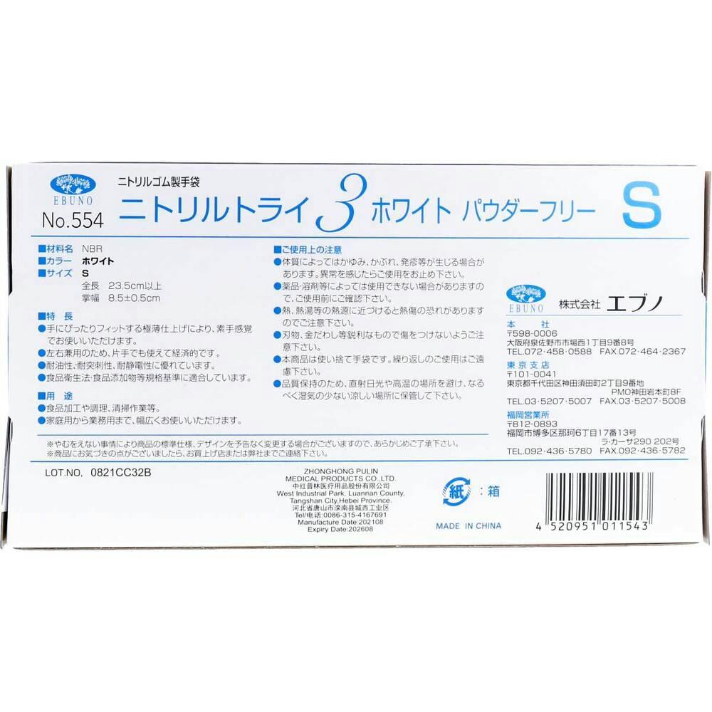 【業務用】No.554 ニトリルトライ3 ホワイト パウダーフリー ニトリルゴム製 使い捨て手袋 Sサイズ 100枚入 ×1点【送料込み】 #4520951011543