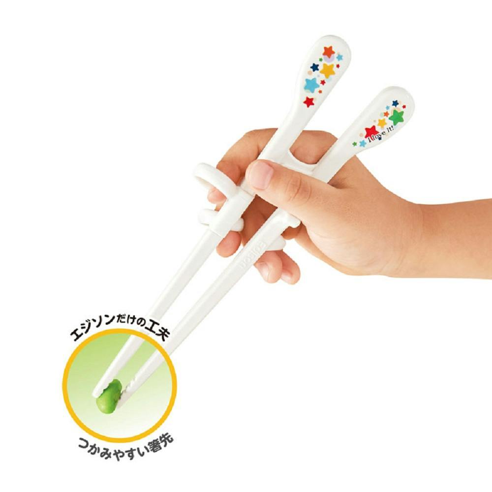 リングに指を入れるだけ!正しく持てる設計!正しい指の角度をサポートするリング形状なのでリングに指を入れるだけですぐに正しく使える!カラフルな星柄で、入園~小学校低学年までのお子様向きのお箸。●連結部で1本1本のお箸を固定し交差防止。●食事をしながら正しい持ち方が身に付く。●連結部が分離できて洗浄カンタン。●箸先が凸凹でつかみやすい工夫。●3ステップで一般のお箸に移行!