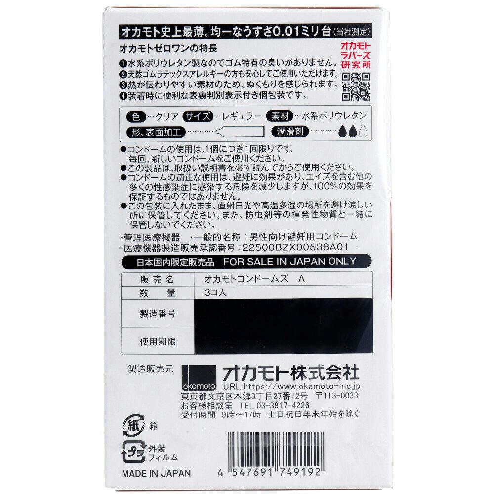 オカモトゼロワン 0.01ミリ コンドーム 3個入 ×1点【送料込み】 #4547691749192