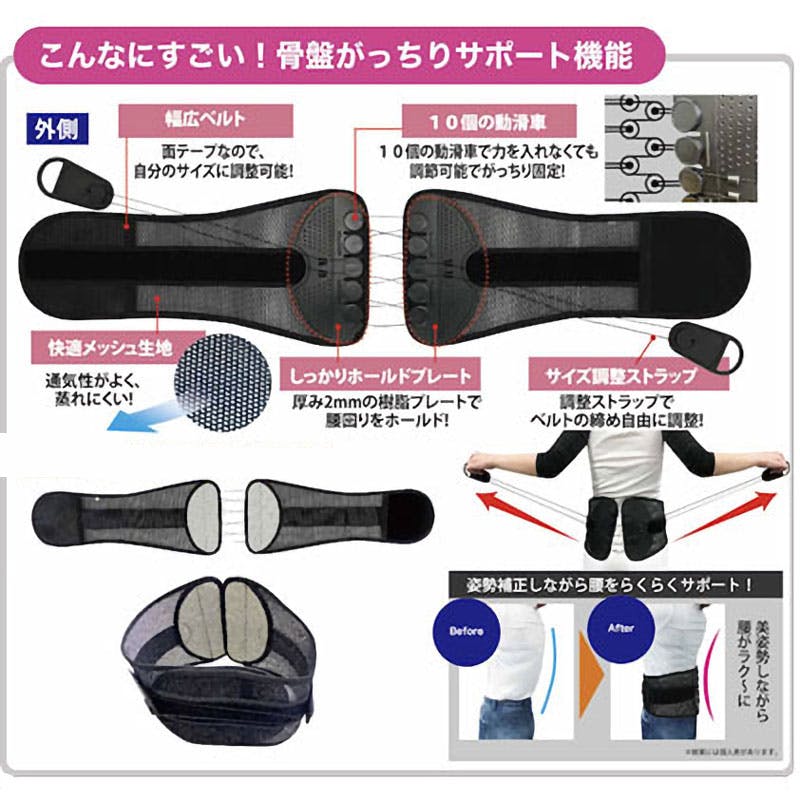 腰回りをがっちり&しっかりサポート!腰楽!着用したら調節ストラップで自分サイズに調整!●幅広ベルト:面テープなので自分サイズに調整可能。●10個の動滑車:力を入れなくても調節可能でがっちり固定。●快適メッシュ生地:通気性がよく蒸れにくい。●しっかりホールドプレート:厚み2mmの樹脂プレートで腰回りをホールド。●サイズ調整ストラップ:ベルトの閉め自由に調整。●姿勢補正:美姿勢しながら腰をらくらくサポート。