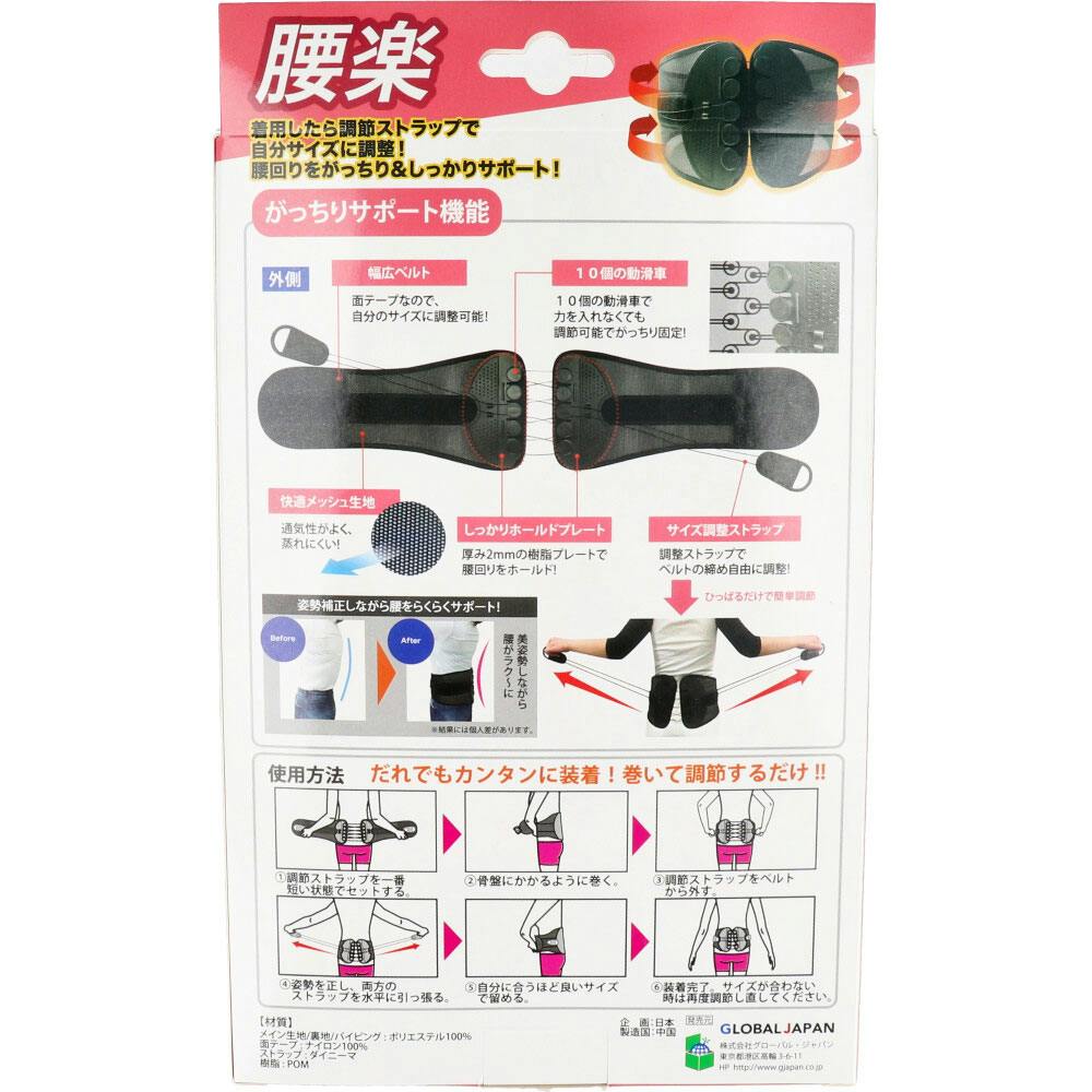 腰回りをがっちり&しっかりサポート!腰楽!着用したら調節ストラップで自分サイズに調整!●幅広ベルト:面テープなので自分サイズに調整可能。●10個の動滑車:力を入れなくても調節可能でがっちり固定。●快適メッシュ生地:通気性がよく蒸れにくい。●しっかりホールドプレート:厚み2mmの樹脂プレートで腰回りをホールド。●サイズ調整ストラップ:ベルトの閉め自由に調整。●姿勢補正:美姿勢しながら腰をらくらくサポート。
