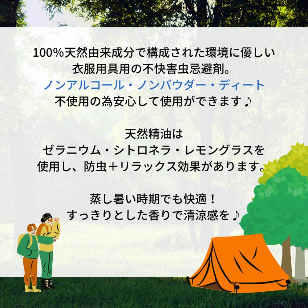 天然精油の香りでガード!テント周りの虫除けに天然精油の香りでしっかりガード100%天然由来成分で構成された環境に優しい衣服用具用の不快害虫忌避剤です。●屋内外での服、帽子、スニーカー・布素材のキャンプ用品 (テント・椅子等)や、テント周りにスプレーするだけで周囲に虫よけ空間をつくります●お子様にも安心、安全な日本製●5つの特徴(1)100%天然由来成分で安心安全な不快害虫忌避剤(2)ノンアルコール・ノンパウダー・ディート不使用(3)マイナスイオン効果で、消臭効果(4)さわやか