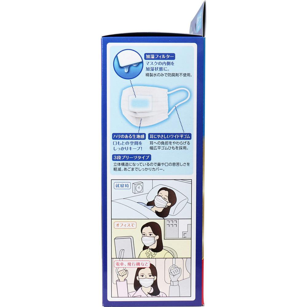 乾燥するのど・鼻に!口もとに貼りつきにくく、長時間快適!●加湿フィルター:マスクの内側を加湿状態に。精製水のみで防腐剤不使用。●ハリのある生地感:口もとの空間をしっかりキープ。●耳にやさしいワイド平ゴム:耳への負担をやわらげる幅広平ゴムひもを採用。●3段プリーツタイプ:立体構造で、鼻や口の息苦しさを軽減。あごまでしっかりカバー。