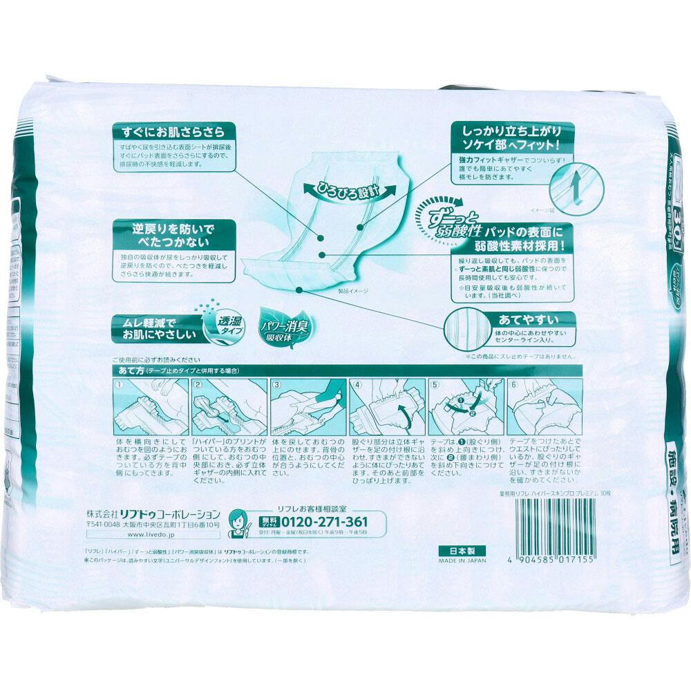 (1)体を横向きにしておむつをおきます。必ずテープのついている方を背中側にもってきます。(2)「ハイパー」のプリントがついている方をおむつ側にして、おむつの中央部におき、必ず立体ギャザーの内側に入れてください。(3)体を戻しておむつの上にのせます。背骨の位置と、おむつの中心が合うようにしてください。(4)股ぐり部分は立体ギャザーを足の付け根に沿わせ、すきまができないように体にぴったりあてます。そのあと前部をひっぱり上げます。(5)テープは股ぐり側を斜め上向きにつけ、次に腰まわ