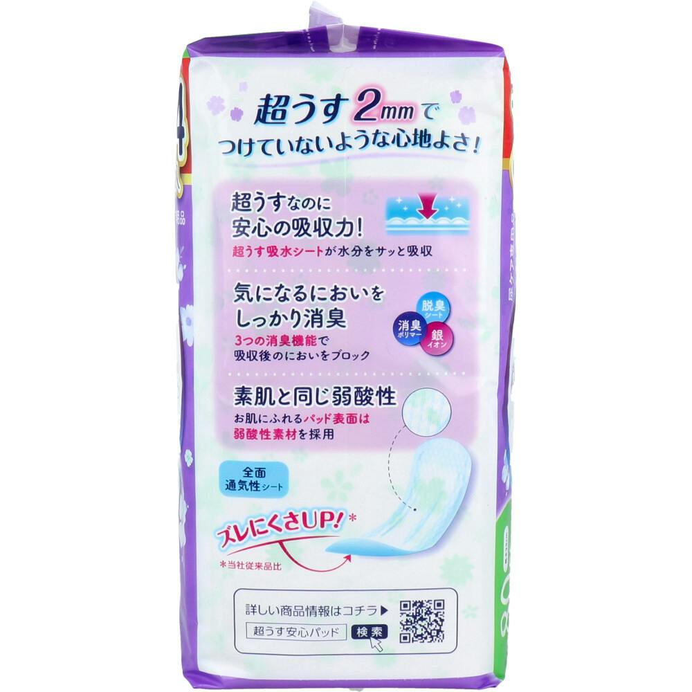 超うす2mmで、つけていないような心地よさ♪超うすなのに、安心の吸収力。超うす吸収体で、驚きのうすさと高い吸収性能を両立。圧倒的なつけ心地の良さを実感していただけます。●お肌へのやさしさにも配慮。弱酸性素材を採用し、さらっとしたつけ心地になりました。●気になるにおいをしっかり消臭。3方向から気になる「におい」に対処するので、人と会うときも安心です。●コンパクトで携帯に便利。超うす型のパッドなので、ポーチにもすっきり収まります。●花柄の個包装デザイン。携帯時や使用時の抵抗感を和