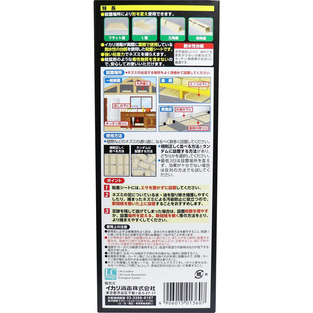 絡みついて逃がさない、強い粘着力でネズミを捕えます。設置場所により形を変え使用できます。フラット型、L型、三角型、四角型に変形自在です。イカリ消毒が実際に業務で使用している耐水性の台紙を使用した粘着シートです。●殺鼠剤のような毒性物質を含まないので、安心してお使いいただけます。●耐水性台紙で水を吸収しにくく、ぬれても変形が少ない台紙なので、キッチン・厨房等の水回りに最適です。