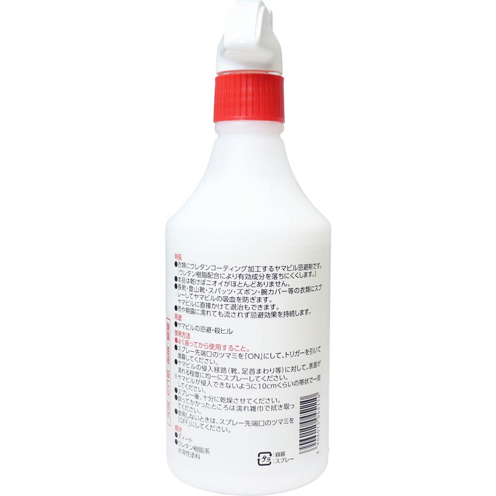 衣類にウレタンコーティング加工するヤマビル忌避剤です。衣類にスプレーし、ヤマビルの吸血を防ぐ!●ウレタン樹脂配合により有効成分を落ちにくくします。●本品は乾けばニオイがほとんどありません。●長靴・登山靴・スパッツ・ズボン・腕カバー等の衣類にスプレーしてヤマビルの吸血を防ぎます。●ヤマビルに直接かけても退治できます。●雨や朝露に濡れても流れず忌避効果を持続します。