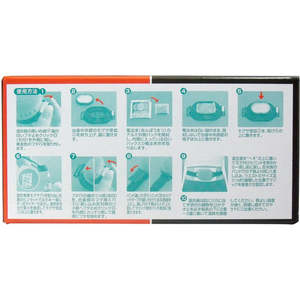 上に置きます。(7)フタの端のツメ部を台座部のフタ挿入穴に差し込み反対側のツメ部へフタ止めクリックを内側にカッチリ倒して確実にフタを閉めます。(8)バンド通し穴にバンドのマジックテープが縫い付けてある表面を上にし通し穴の下側より入れ上に回してマジック部をバンド表面に接着させます。(9)温灸器を“へそ”の上に置いて(8)で付けたバンドを背中から一周し前に戻し、反対側のバンド穴の下側より同じく差し込み、ウエストのサイズ迄ひっぱり調整した位置でマジックを接着させ固定します。(10)