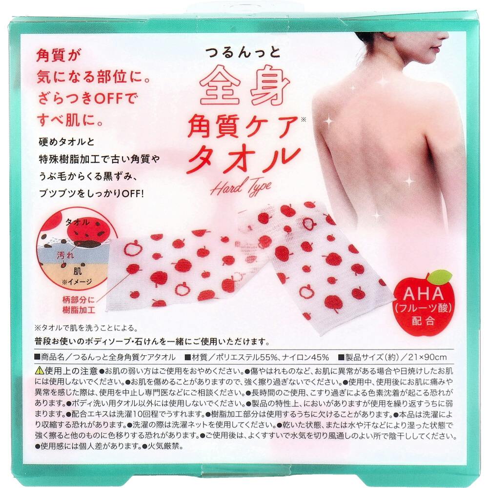 角質が気になる部位に。 ざらつきOFFですべ肌に。特殊樹脂加工×硬めタオルの効果で、気になるボディの黒ずみやブツブツをしっかりケア。●AHA(フルーツ酸)配合。ざらつきOFFでつるすべ肌に。●柄の部分に特殊な樹脂加工が施されており、全身の古い角質やうぶ毛などを取り除いてくれます。●水で洗うだけでも効果を発揮してくれるのも嬉しいポイント。●普段お使いのボディソープ・石けんを一緒にご使用いただけます。