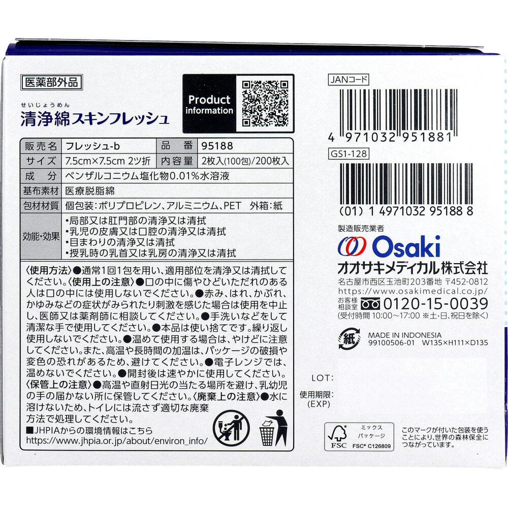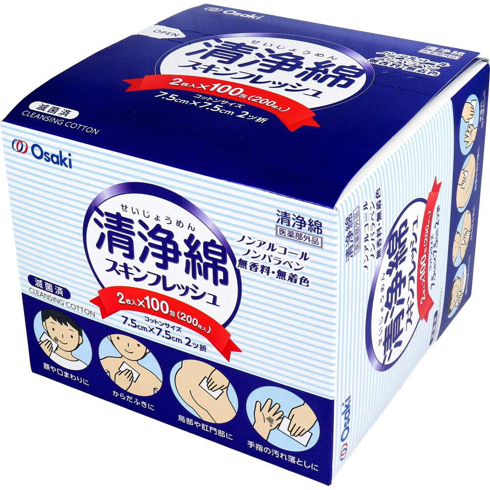 清浄綿スキンフレッシュ 7.5cm×7.5cm 2ツ折 2枚入×100包(200枚入) ×1点【送料込み】 #4971032951881