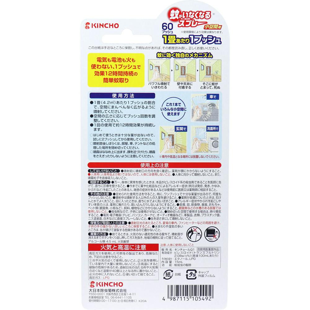 金鳥 蚊がいなくなるスプレー 小空間用 無香料 60プッシュ 15mL ×1点【送料込み】 #4987115105492