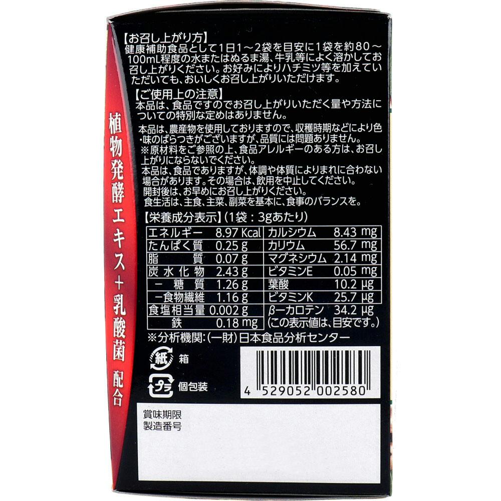 75種の素材を発酵した植物発酵エキス配合青汁!!4種類の九州産野菜(大麦若葉・ケール・明日葉・ゴーヤ)と植物発酵エキス、乳酸菌を配合した青汁です。●乳酸菌100億個配合。(1袋:3gあたり/製造時配合菌数)●香料・着色料無添加。●粉末タイプ・スティックパック。