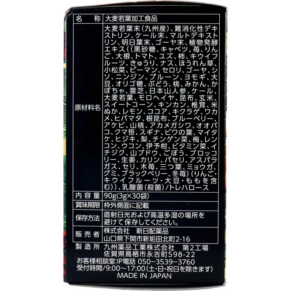 大麦若葉末(九州産)、難消化性デキストリン、ケール末、マルトデキストリン、明日葉、ゴーヤ末、植物発酵エキス((黒砂糖、キャベツ、苺、りんご、大根、トマト、ユズ、柿、キウイフルーツ、きゅうり、ナス、ほうれん草、小松菜、ピーマン、セロリ、ゴーヤ、シソ、ニンジン、プルーン、ヨモギ、大豆、オリゴ糖、ぶどう、桃、みかん、かぼちゃ、霊芝、日本山人参、ケール、大麦若葉、モロヘイヤ、昆布、玄米、スイートコーン、キンカン、椎茸、米ぬか、レモン、ココア、キクラゲ、ワカメ、ヒバマタ、根昆布、ブルー