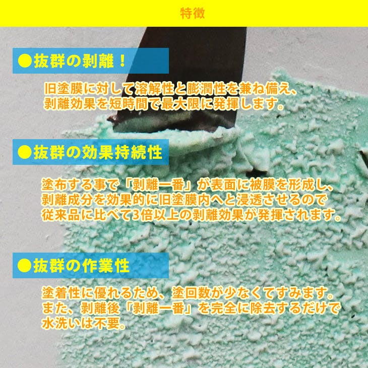 強力塗膜剥離剤!「剥離一番」●抜群の剥離!旧塗膜に対して溶解性と膨潤性を兼ね備え、剥離効果を短時間で最大限に発揮します。●抜群の効果持続性!塗布する事で「剥離一番」が表面に被膜を形成し、剥離成分を効果的に旧塗膜内へと浸透させるので従来品に比べて3倍以上の剥離効果が発揮されます。●抜群の作業性!塗着性に優れるため、塗回数が少なくてすみます。また、剥離後「剥離一番」を完全に除去するだけで水洗いは不要。