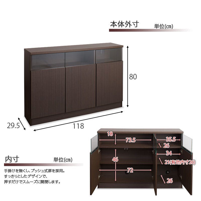 ■商品サイズ/本体:(約)幅118×奥行29.5×高さ80cm■ガラス部内寸/(約)幅(大)73.5(小)35.5×奥行26×高さ18cm■扉内寸/(約)幅(大)72(小)34×奥行26(棚板21後部1cm配線用隙間あり)×高さ46cm■棚板/可動式(大)(小)各1枚(6cmピッチ・3段階)■耐荷重量/天板:(約)20kg、棚板:(約)5kg■商品重量/(約)28kg■日本製■完成品