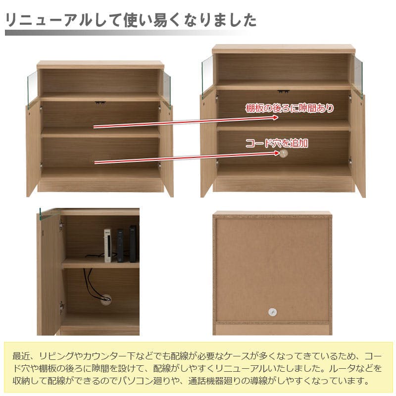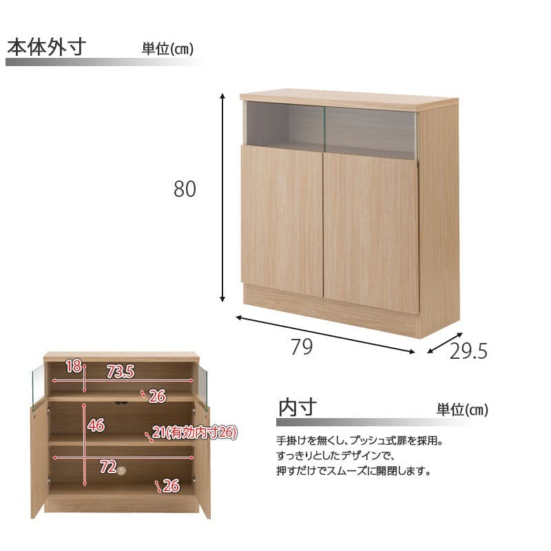 ■商品サイズ/本体:(約)幅79×奥行29.5×高さ80cm■ガラス部内寸/(約)幅73.5×奥行26×高さ18cm■扉内寸/(約)幅72×奥行26(棚板21後部1cm配線用隙間あり)×高さ46cm■棚板/可動式1枚(6cmピッチ・3段階)■耐荷重量/天板:(約)20kg、棚板:(約)5kg■商品重量/(約)14kg■日本製■完成品